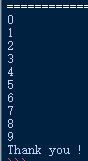 Using the example above, the following code will print all the numbers from 0 to 9 then print only 1 time "Thank you !" :